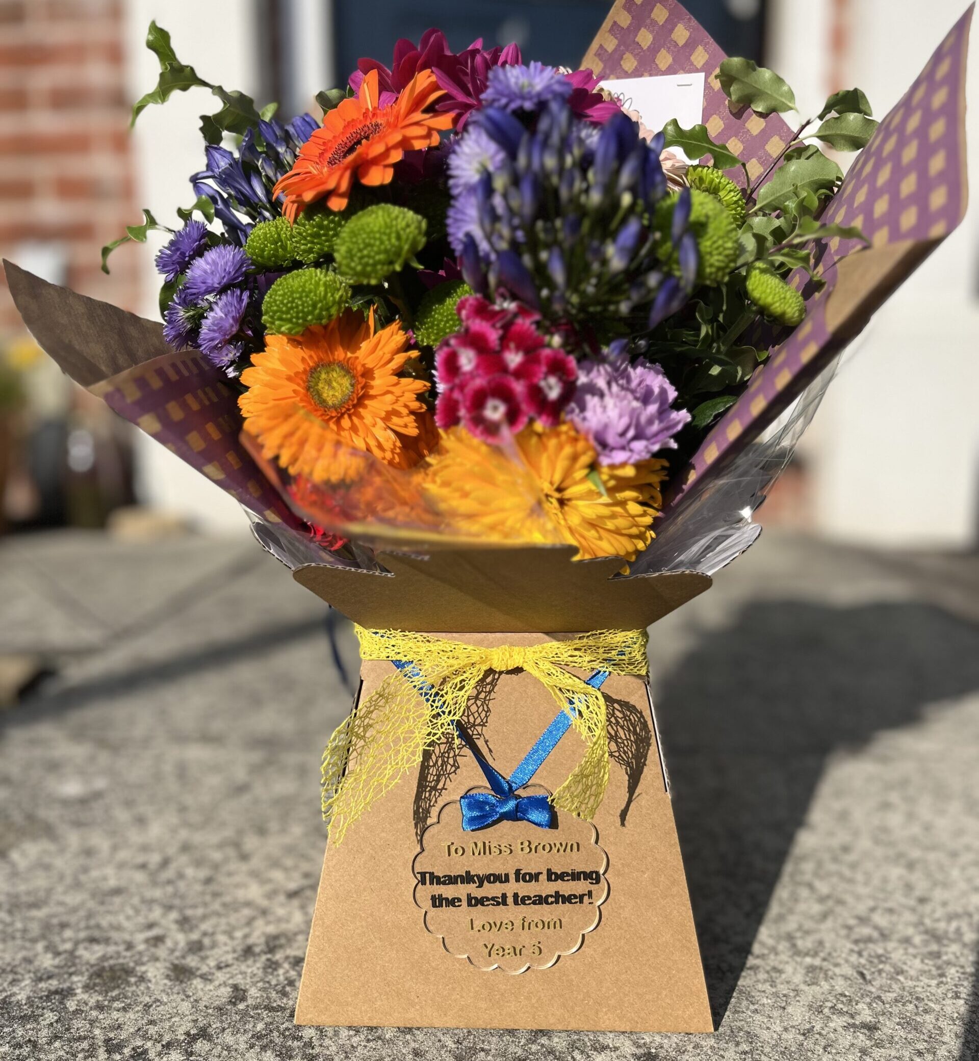 All of our bouquets can be personalised with handmade keepsake decorations. From anniversaries, new homes and birthdays… in fact any occasion, we can add your message to a decoration that will last forever.